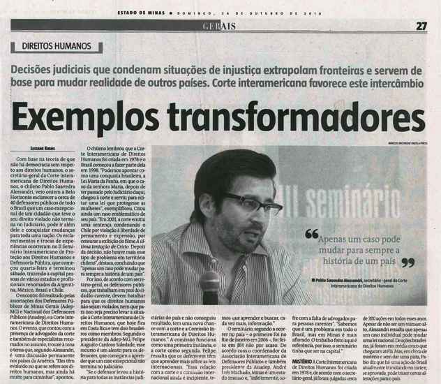 Com base na teoria de que não há democracia sem respeito aos direitos humanos, o secretário-geral da Corte Interamericana de Direitos Humanos, o chileno Pablo Saavedra Alessandri, veio no sábado a Belo Horizonte esclarecer a cerca de 40 defensores públicos de todo o Brasil que um caso excepcional de um cidadão que teve o seu direito violado não termina no Judiciário, pode ir além dele e conquistar mudanças para toda uma nação. Os esclarecimentos e trocas de experiências ocorreram no II Seminário Interamericano de Proteção aos Direitos Humanos e Defensoria Pública, que começou quarta-feira e terminou sábado, trazendo à capital pessoas de vários estados e profissionais renomados da Argentina, México, Brasil e Chile.